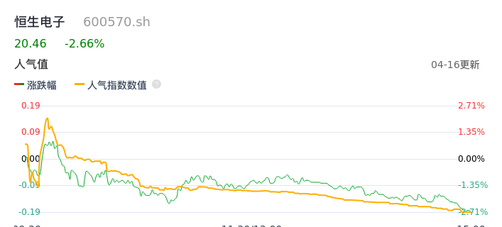 04月16日,恒生电子收报20.46,股价涨幅-2.66%,成交金额5.51亿元,换手率1.40%。