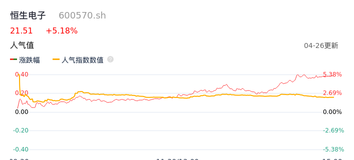 04月26日,恒生电子收报21.51,股价涨幅5.18%,成交金额11.57亿元,换手率2.90%。