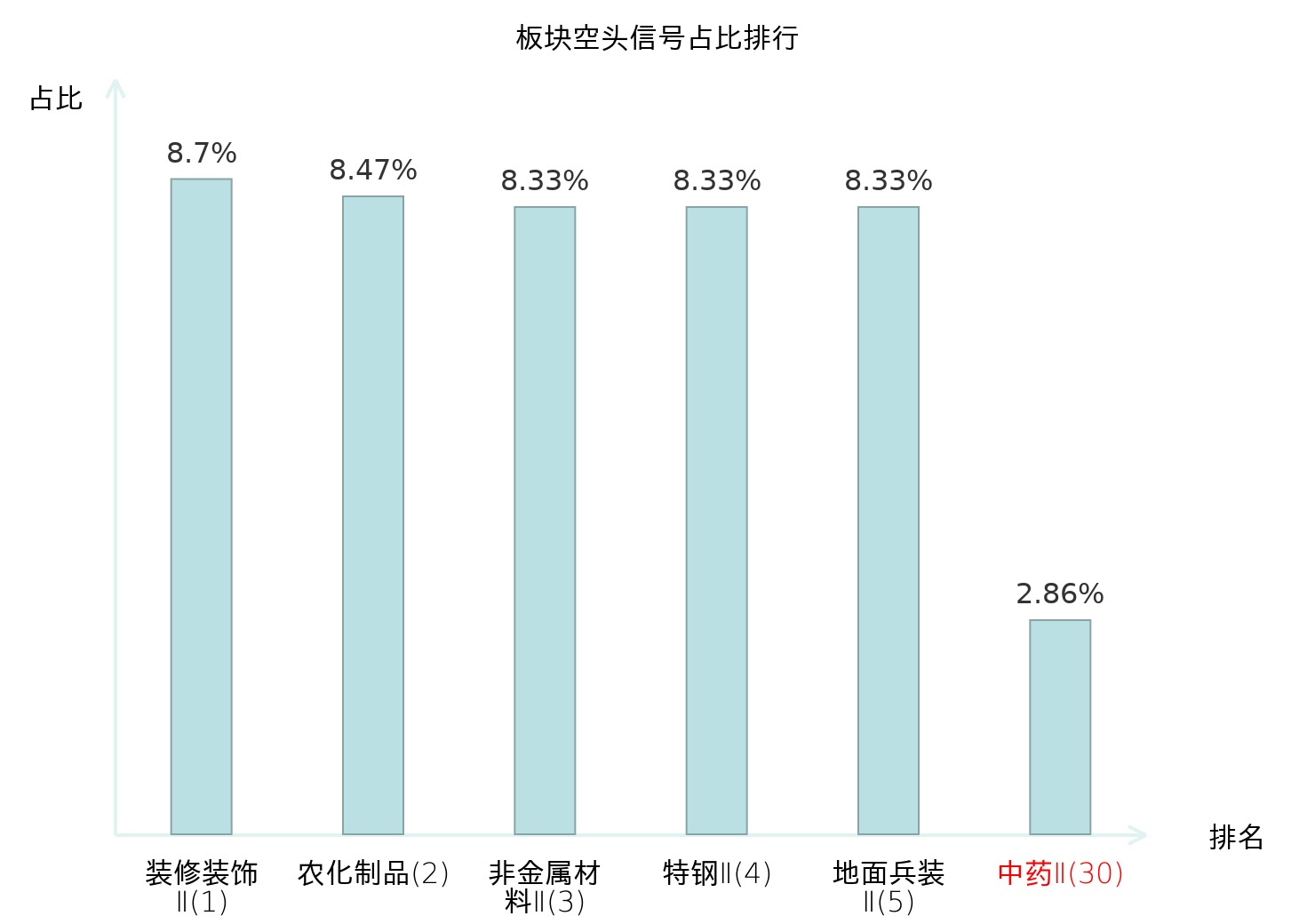 全市场所有行业板块中主力空头信号占比排名中,装修装饰Ⅱ板块位居第一。装修装饰Ⅱ板块名次提升最快,较昨日上升120位。