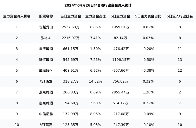 从主力资金流向来看,非白酒行业今日主力资金流入7.33亿元,在所有申万二级行业中排名:116/131。