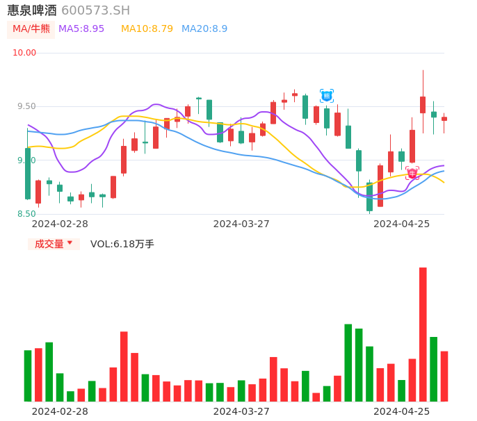 04月25日,惠泉啤酒收报9.40,股价涨幅0.00%,成交金额5774.87万元,换手率2.47%。