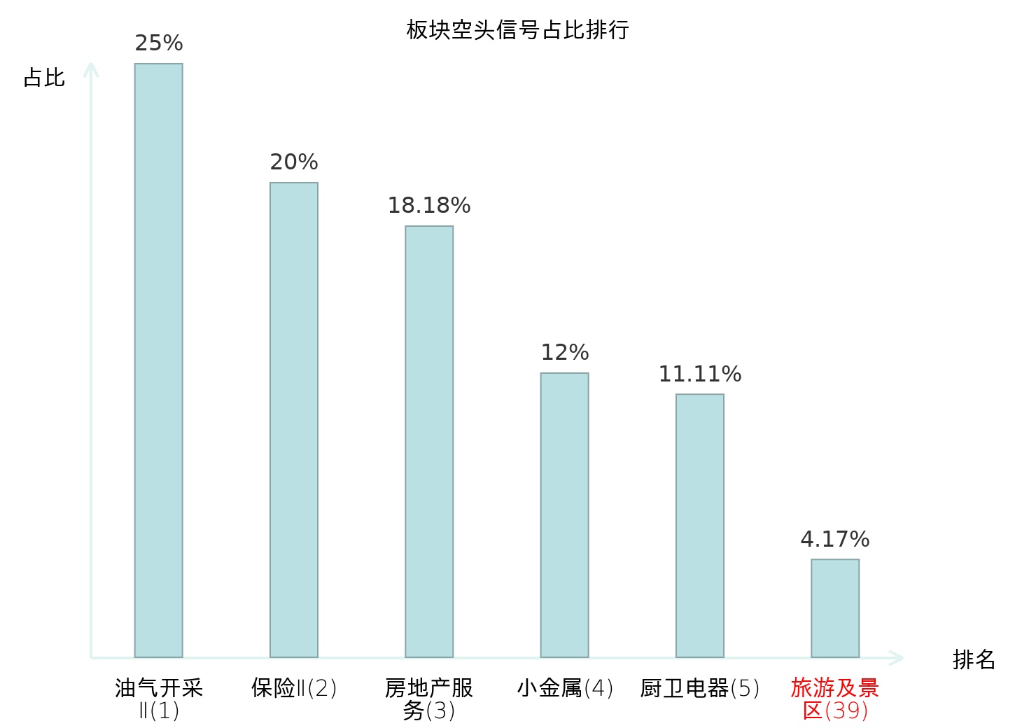 全市场所有行业板块中主力空头信号占比排名中,油气开采Ⅱ板块位居第一。装修建材板块名次提升最快,较昨日上升117位。