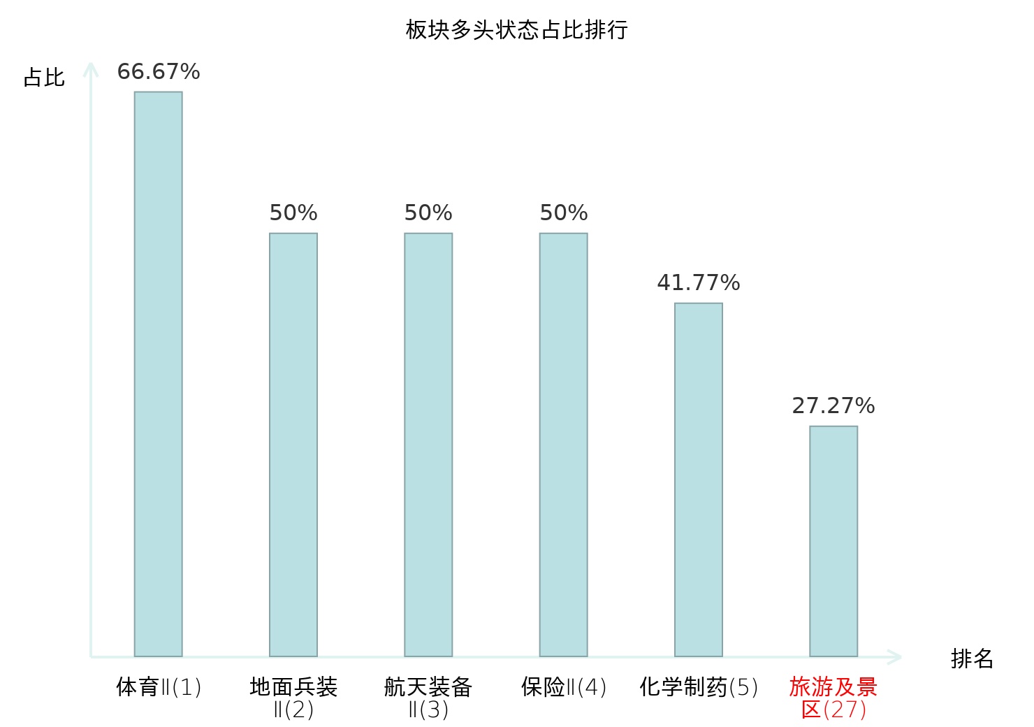 全市场所有行业板块中主力多头状态占比排名中,体育Ⅱ板块位居第一。普钢板块名次提升最快,较昨日上升98位。