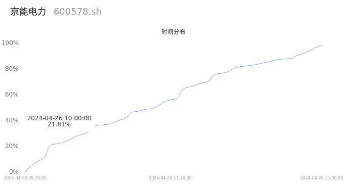600578京能电力2024年04月26日成交29.98万手,成交金额1.02亿元,相较昨日放量9.30万手,换手率0.45%,成交清淡。