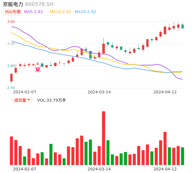 04月12日,京能电力收报3.51,股价涨幅-1.40%,成交金额1.20亿元,换手率0.50%。