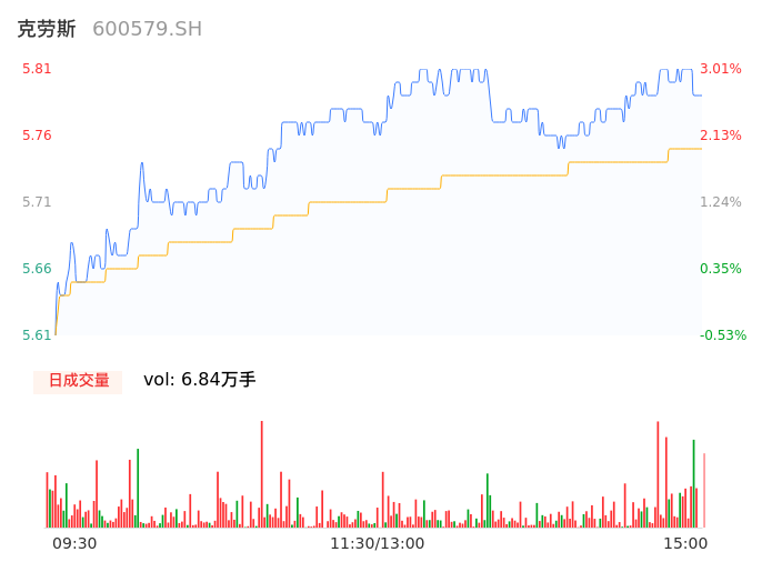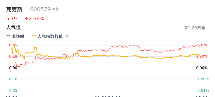 04月26日,克劳斯收报5.79,股价涨幅2.66%,成交金额3933.34万元,换手率1.38%。