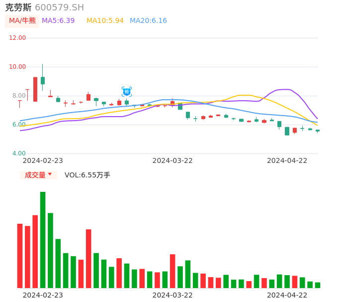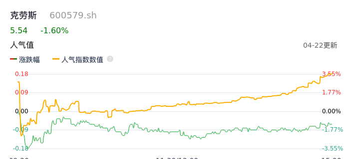 04月22日,克劳斯收报5.54,股价涨幅-1.60%,成交金额3622.52万元,换手率1.32%。