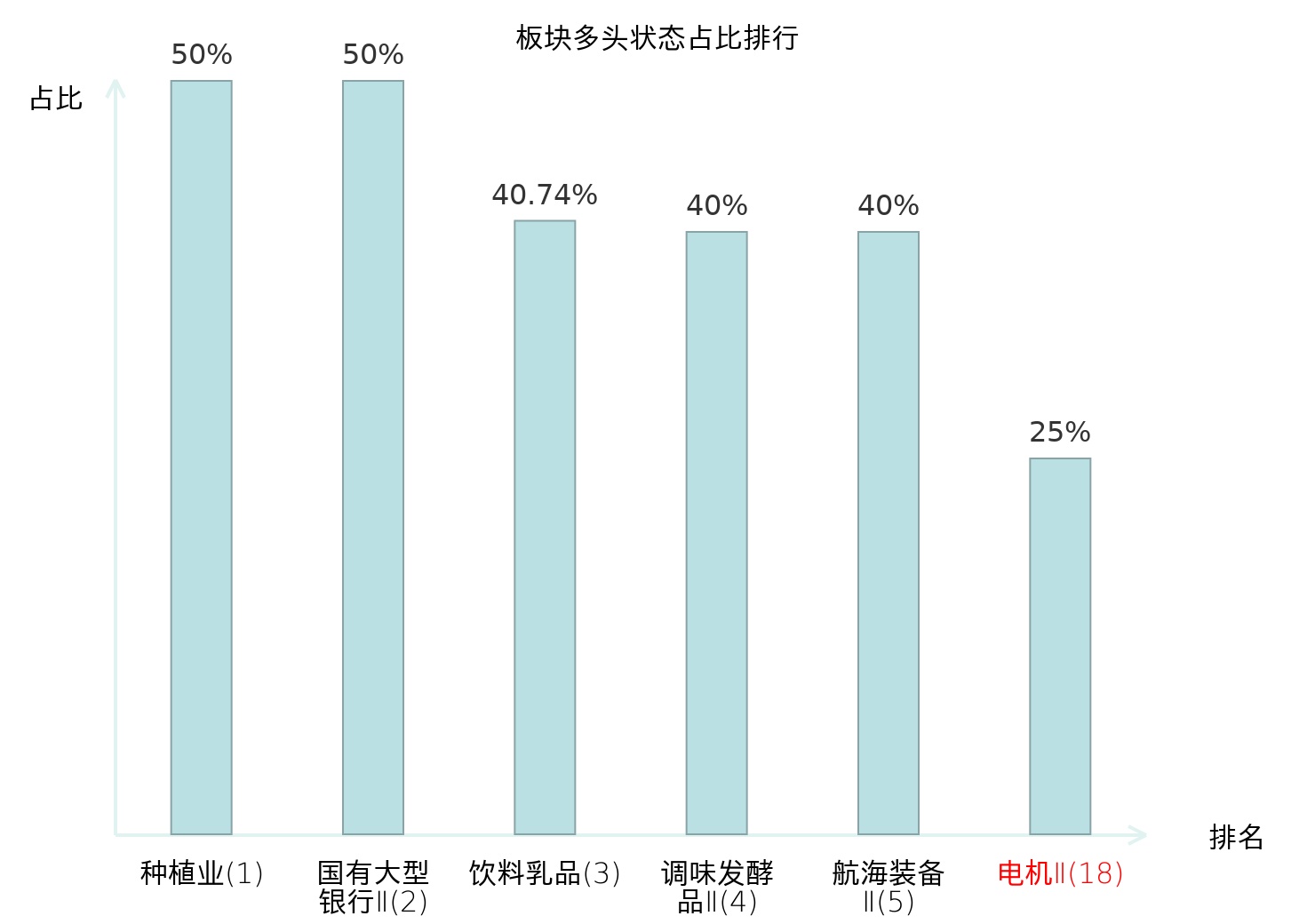 全市场所有行业板块中主力多头状态占比排名中,种植业板块位居第一。冶钢原料板块名次提升最快,较昨日上升89位。