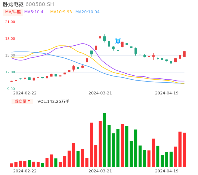 04月19日,卧龙电驱收报15.73,股价涨幅4.52%,成交金额21.81亿元,换手率10.87%。