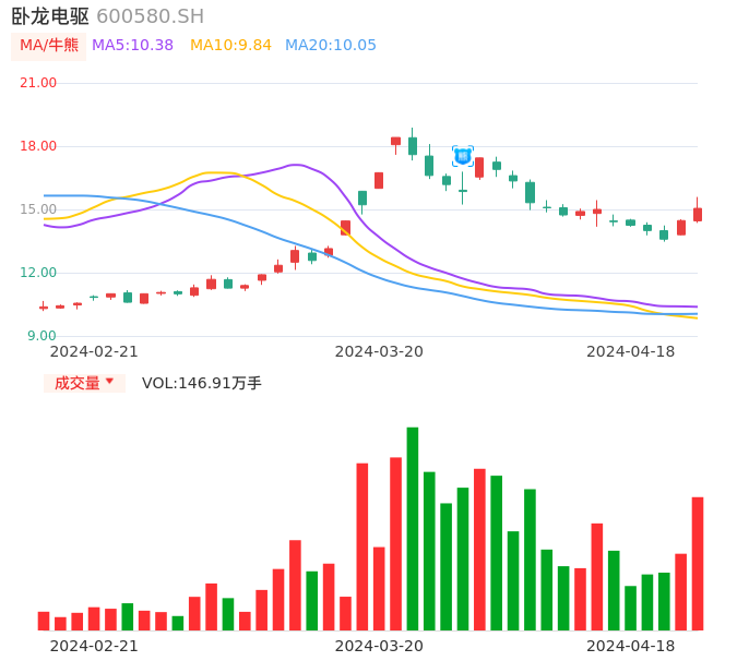 04月18日,卧龙电驱收报15.05,股价涨幅4.01%,成交金额22.14亿元,换手率11.23%。