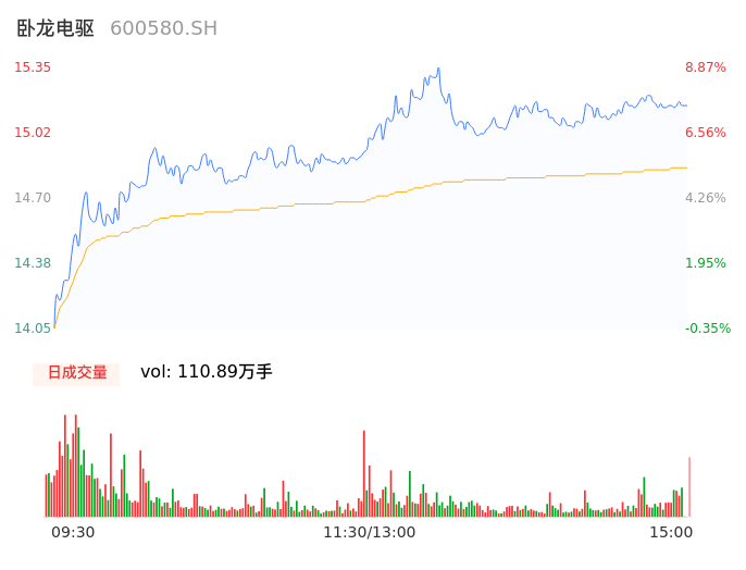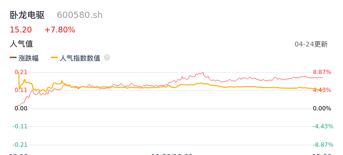 04月24日,卧龙电驱收报15.20,股价涨幅7.80%,成交金额16.48亿元,换手率8.48%。