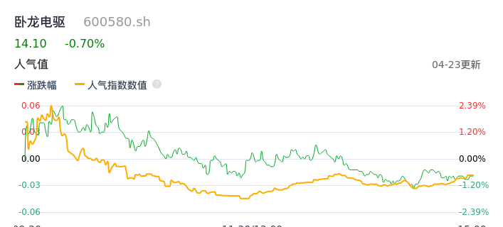 04月23日,卧龙电驱收报14.10,股价涨幅-0.70%,成交金额8.70亿元,换手率4.65%。