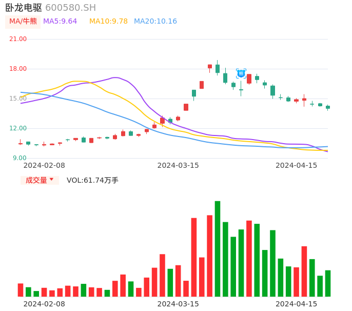 04月15日,卧龙电驱收报14.00,股价涨幅-1.75%,成交金额8.68亿元,换手率4.72%。