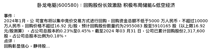 值得注意的是:2024年04月东北证券的韩金呈分析师,首次发布关于卧龙电驱的研究报告,标题为:卧龙电驱(600580):回购股份长效激励 积极布局储能&低空经济。