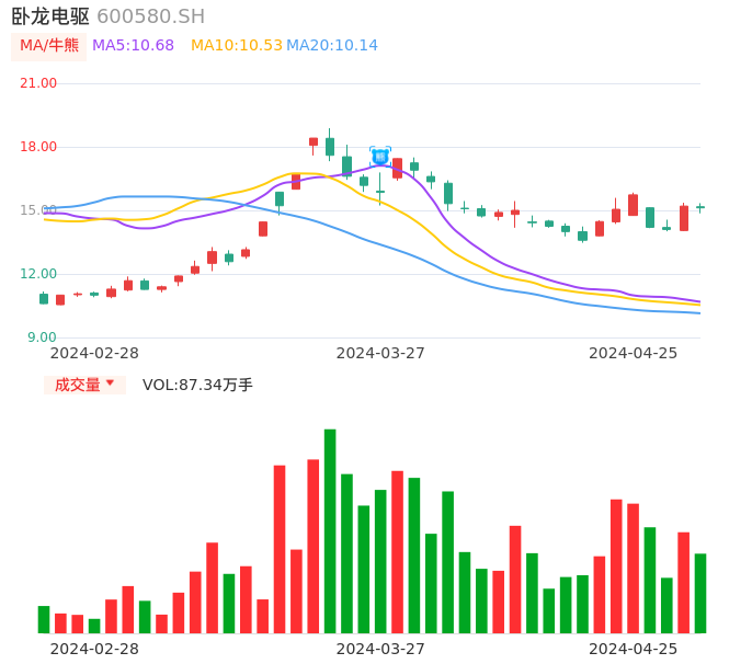 04月25日,卧龙电驱收报15.12,股价涨幅-0.53%,成交金额13.19亿元,换手率6.68%。