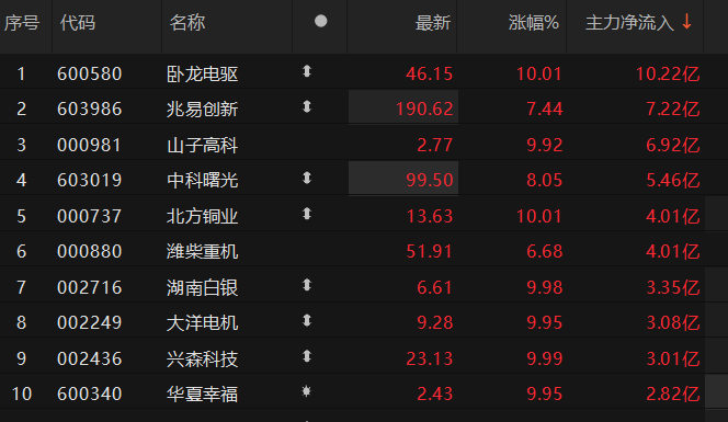 上证报中国证券网讯 9月12日10时30分,4只A股的主力资金净流入超5亿元。其中,卧龙电驱净流入超10亿元,位居首位。5只A股的主力资金净流出超5亿元。其中,工业富联净流出超10亿元。