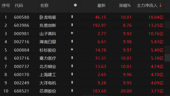 上证报中国证券网讯 9月12日14时30分,3只A股的主力资金净流入超10亿元。其中,卧龙电驱净流入超18亿元,位居首位。5只A股的主力资金净流出超10亿元。其中,立讯精密净流出超20亿元。