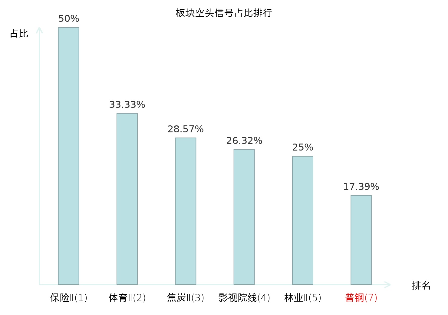 全市场所有行业板块中主力空头信号占比排名中,保险Ⅱ板块位居第一。装修建材板块名次提升最快,较昨日上升118位。