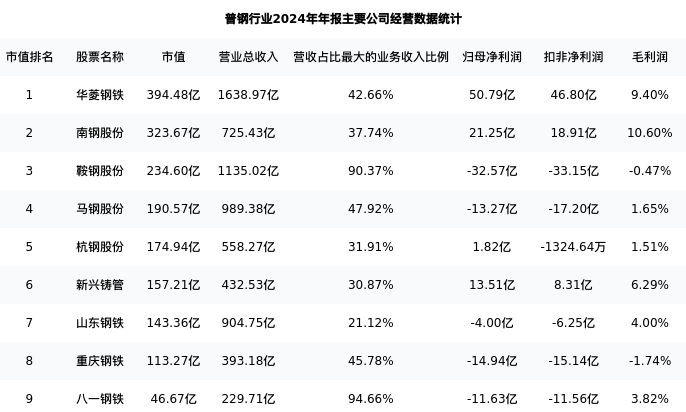 八一钢铁最新报告期数据为年报,下表汇总了普钢行业内市值靠前的公司年报主要经营数据