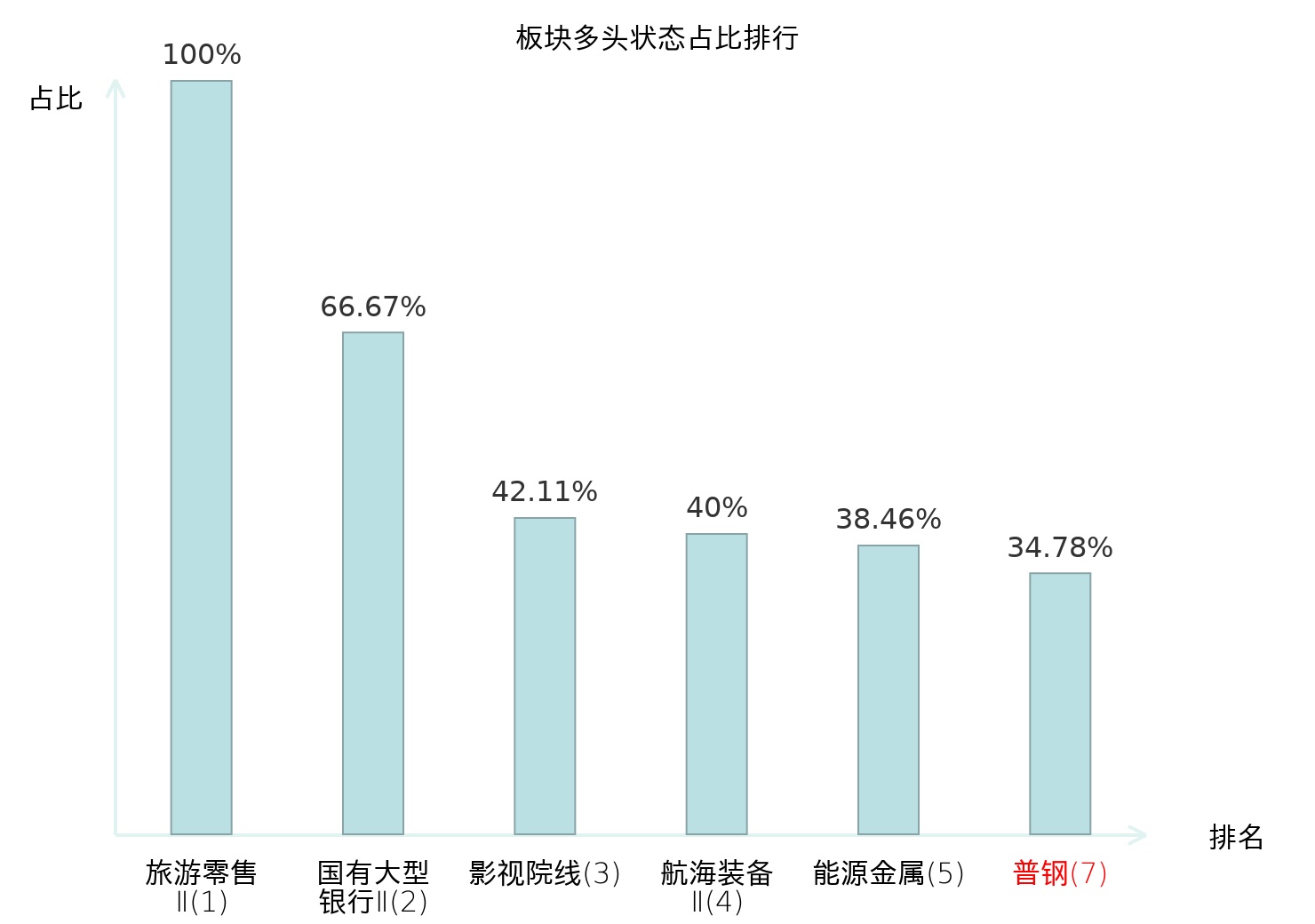 全市场所有行业板块中主力多头状态占比排名中,旅游零售Ⅱ板块位居第一。林业Ⅱ板块名次提升最快,较昨日上升102位。