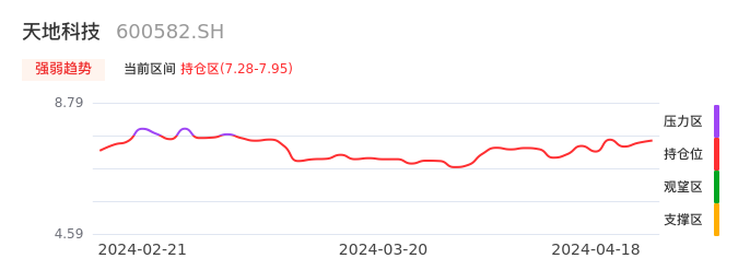 我们来看一下该股的九方特色指标强弱趋势的情况:天地科技自03月06日从压力区回到持仓区。股价在持仓区盘整一段时间后,目前有启稳迹象。后续重点关注上方压力位:7.95元是否能重新上攻。