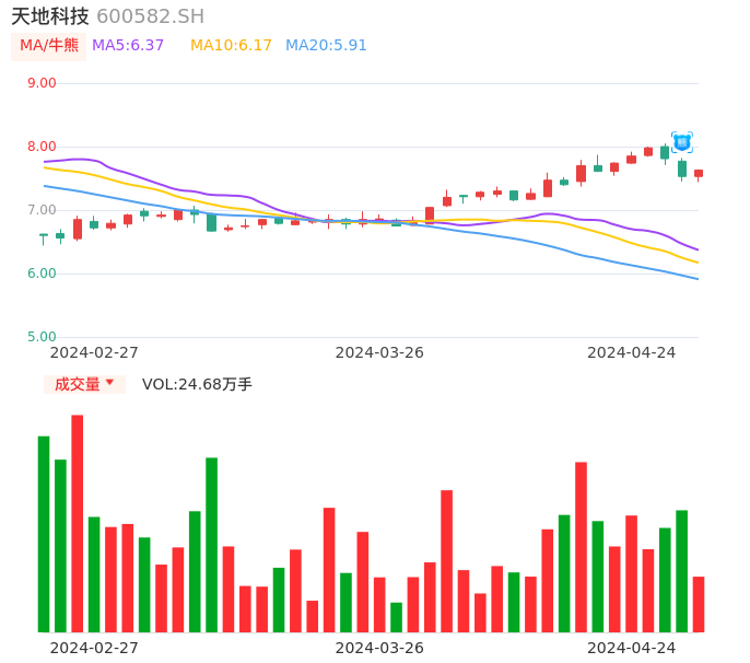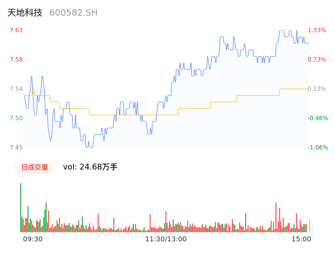 04月24日,天地科技收报7.63,股价涨幅1.33%,成交金额1.86亿元,换手率0.60%。