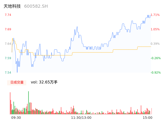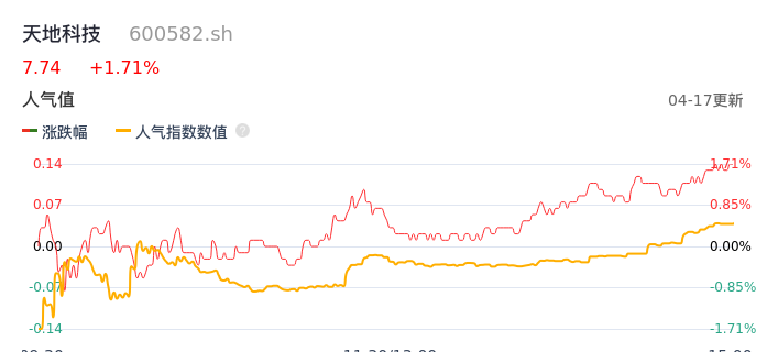 04月17日,天地科技收报7.74,股价涨幅1.71%,成交金额2.49亿元,换手率0.79%。