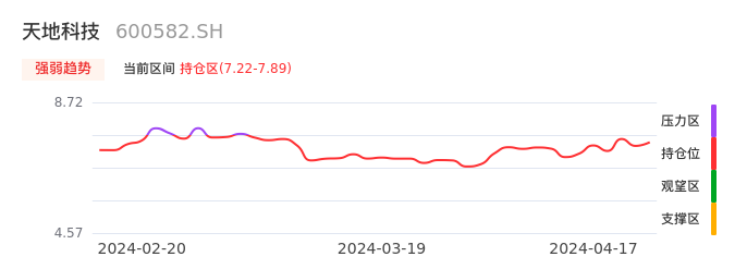 我们来看一下该股的九方特色指标强弱趋势的情况:天地科技自03月06日从压力区回到持仓区。股价在持仓区盘整一段时间后,目前有启稳迹象。后续重点关注上方压力位:7.89元是否能重新上攻。