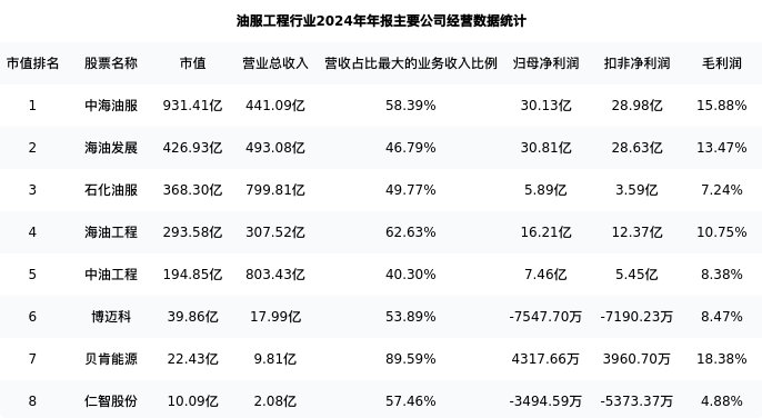 海油工程最新报告期数据为年报,下表汇总了油服工程行业内市值靠前的公司年报主要经营数据