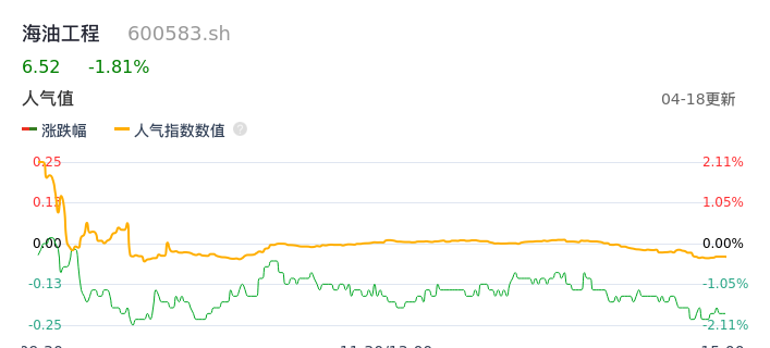04月18日,海油工程收报6.52,股价涨幅-1.81%,成交金额2.72亿元,换手率0.94%。