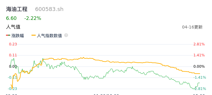 04月16日,海油工程收报6.60,股价涨幅-2.22%,成交金额3.76亿元,换手率1.27%。