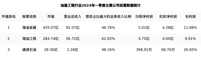 海油工程最新报告期数据为一季度,下表汇总了油服工程行业内市值靠前的公司一季度主要经营数据