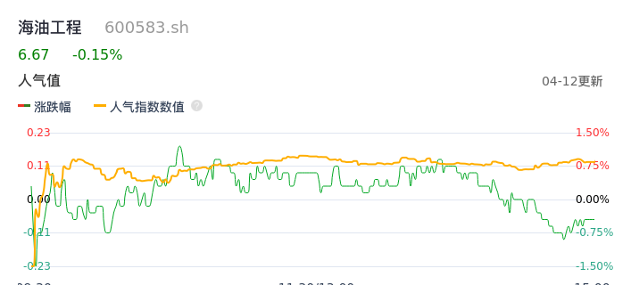 04月12日,海油工程收报6.67,股价涨幅-0.15%,成交金额2.13亿元,换手率0.72%。
