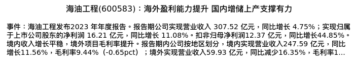 值得注意的是:2024年04月东兴证券的任天辉分析师,首次发布关于海油工程的研究报告,标题为:海油工程(600583):海外盈利能力提升 国内增储上产支撑有力。
