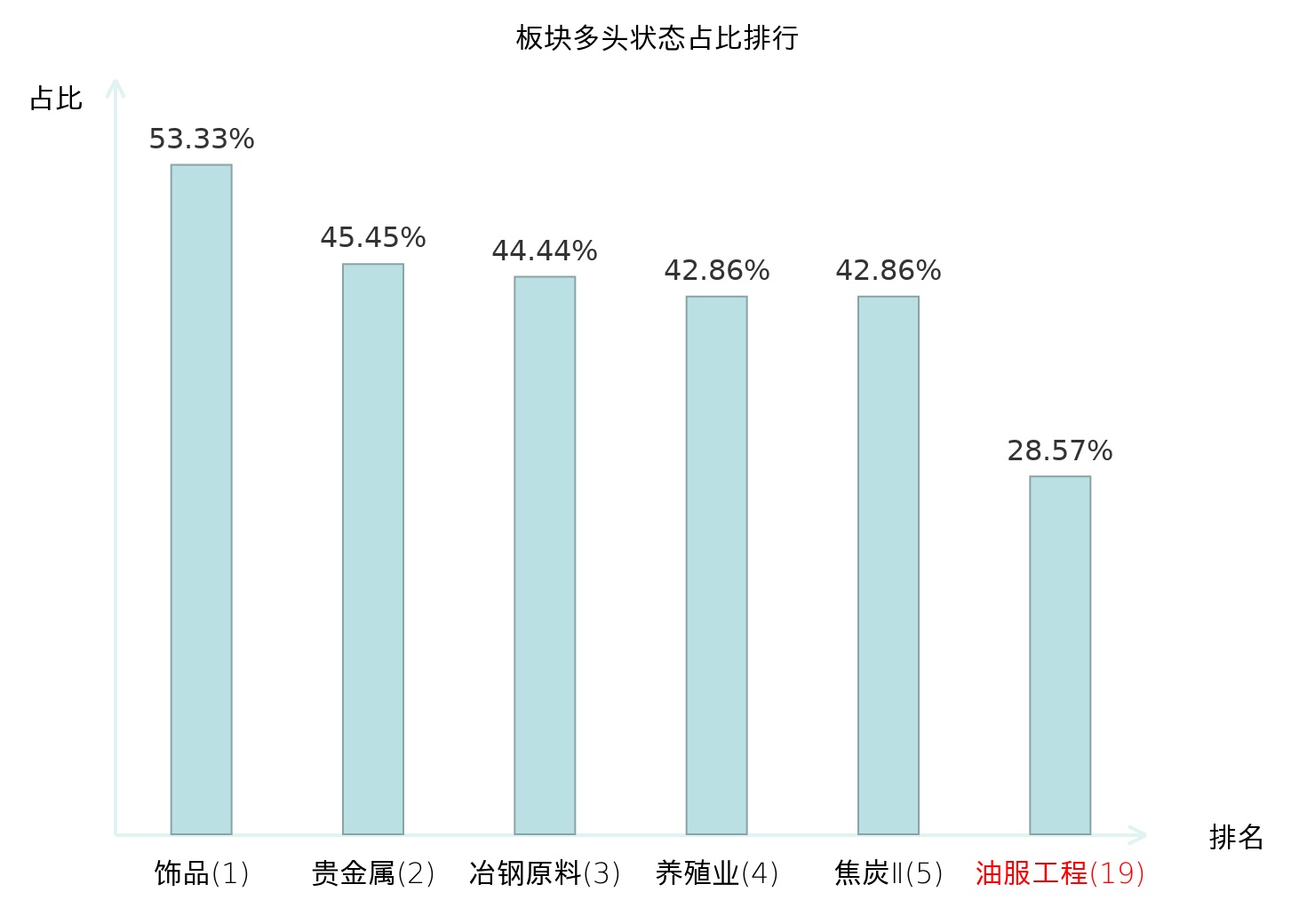 全市场所有行业板块中主力多头状态占比排名中,饰品板块位居第一。非金属材料Ⅱ板块名次提升最快,较昨日上升58位。