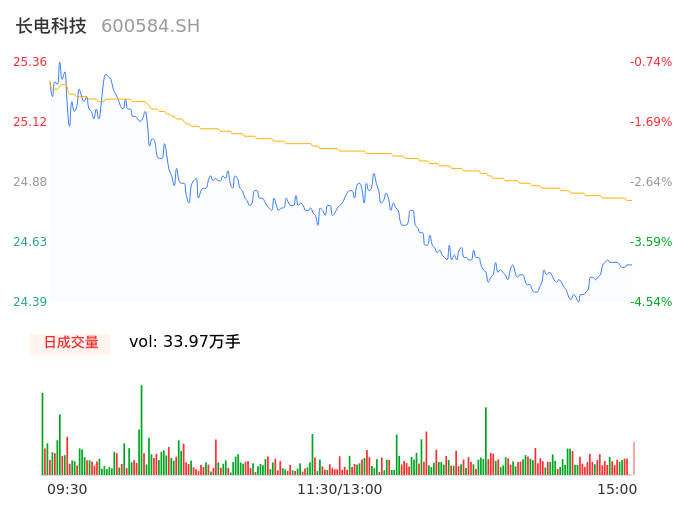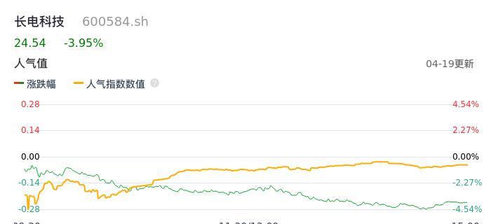 04月19日,长电科技收报24.54,股价涨幅-3.95%,成交金额8.43亿元,换手率1.90%。