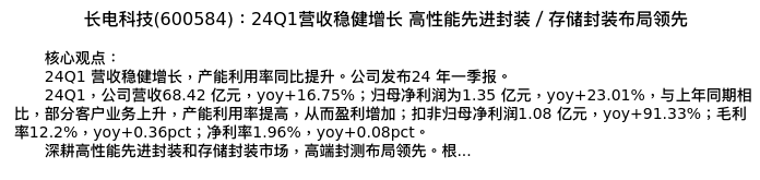 值得注意的是:2024年05月广发证券的王亮/耿正/焦鼎分析师,首次发布关于长电科技的研究报告,标题为:长电科技(600584):24Q1营收稳健增长 高性能先进封装/存储封装布局领先。