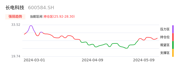 我们来看一下该股的九方特色指标强弱趋势的情况:长电科技自04月29日从观望区上穿到持仓区。股价近期在多头区域持续强势上扬,上升动能仍较为充足,可积极关注。后续重点关注上方压力位:28.30元是否能突破上攻。