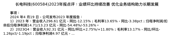 值得注意的是:2024年04月华创证券的耿琛/岳阳分析师,首次发布关于长电科技的研究报告,标题为:长电科技(600584)2023年报点评:业绩环比持续改善 优化业务结构助力长期发展。