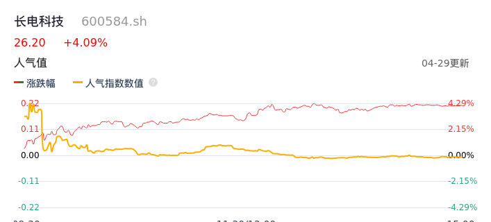 04月29日,长电科技收报26.20,股价涨幅4.09%,成交金额9.99亿元,换手率2.16%。