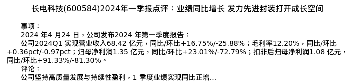 值得注意的是:2024年04月华创证券的耿琛/岳阳分析师,首次发布关于长电科技的研究报告,标题为:长电科技(600584)2024年一季报点评:业绩同比增长 发力先进封装打开成长空间。