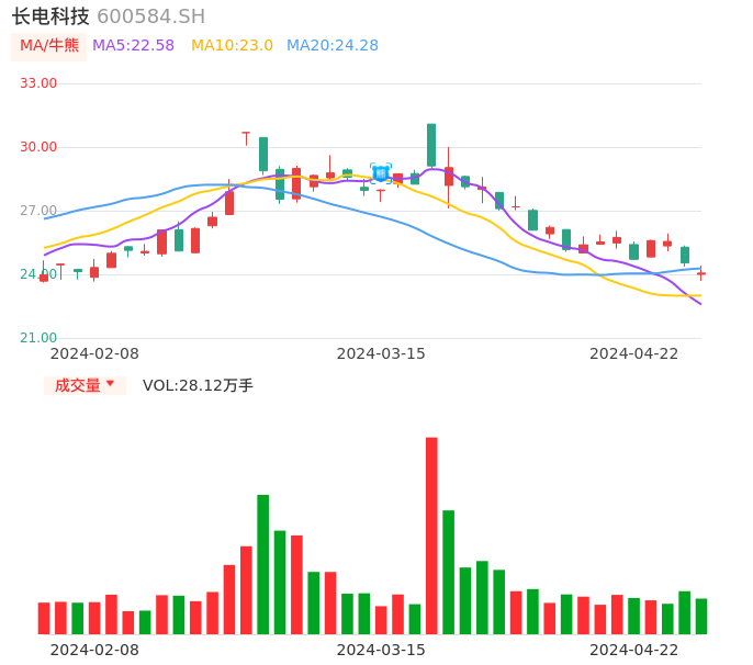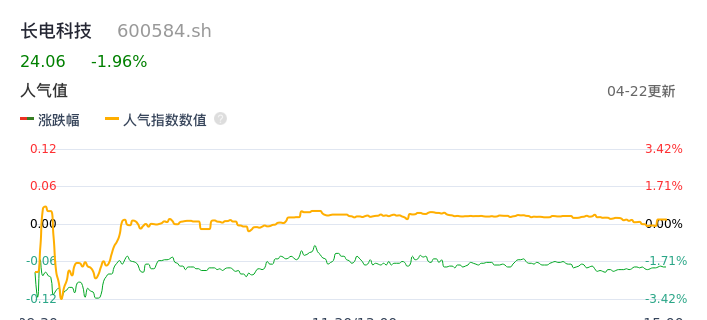 04月22日,长电科技收报24.06,股价涨幅-1.96%,成交金额6.75亿元,换手率1.57%。