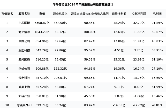 长电科技最新报告期数据为年报,下表汇总了半导体行业内市值靠前的公司年报主要经营数据