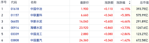 截至发稿,中国中冶(01618.HK)涨逾6%,中联重科(01157.HK)涨超5%。此外,海螺水泥(00914.HK)等多家细分行业龙头也跟涨3%以上。