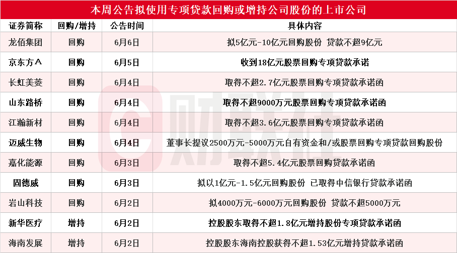 其中,京东方A、龙佰集团、嘉化能源和江瀚新材在本周公告公司获得回购专项贷款上限超过3亿元。