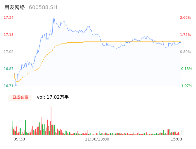 09月18日,用友网络收报17.09,股价涨幅1.18%,成交金额2.91亿元,换手率0.50%。