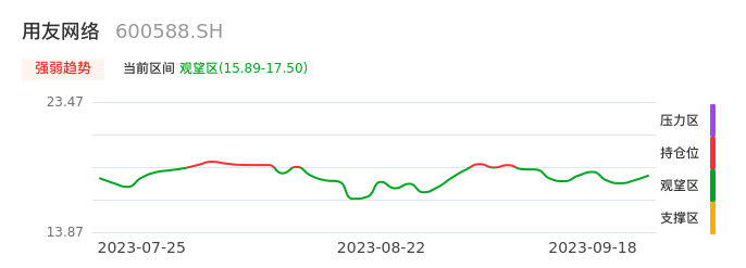我们来看一下该股的九方特色指标强弱趋势的情况:用友网络自09月05日从持仓区下穿到观望区。股价近期持续下跌后,短期出现止跌迹象。后续重点关注能否再次站上多空分界点:17.50元。如未能有效突破则可能进入新一轮空头行情。