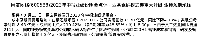 值得注意的是:2023年09月西部证券的邢开允分析师,首次发布关于用友网络的研究报告,标题为:用友网络(600588)2023年中报业绩说明会点评:业务组织模式迎重大升级 业绩短期承压。