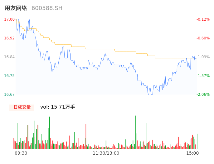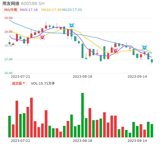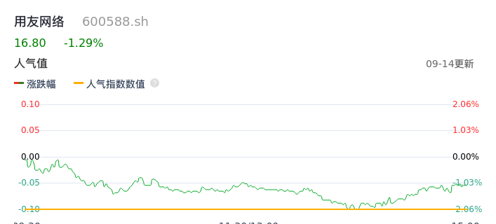 09月14日,用友网络收报16.80,股价涨幅-1.29%,成交金额2.64亿元,换手率0.46%。