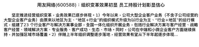 值得注意的是:2023年09月国盛证券的刘高畅/陈芷婧分析师,首次发布关于用友网络的研究报告,标题为:用友网络(600588):组织变革效果初显 员工持股计划彰显信心。